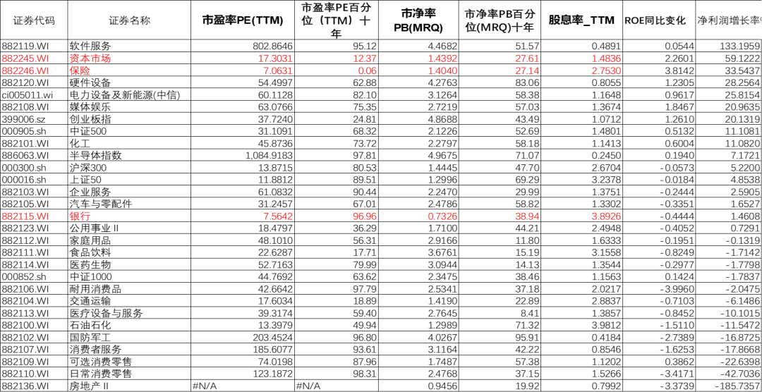 指数与行业估值表