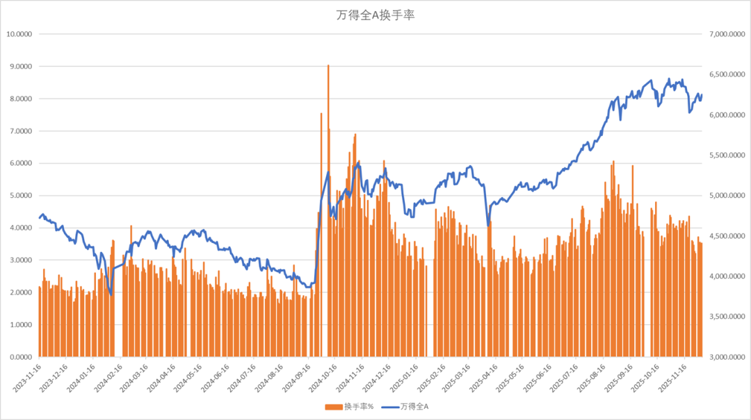全A指数换手率小幅下降。