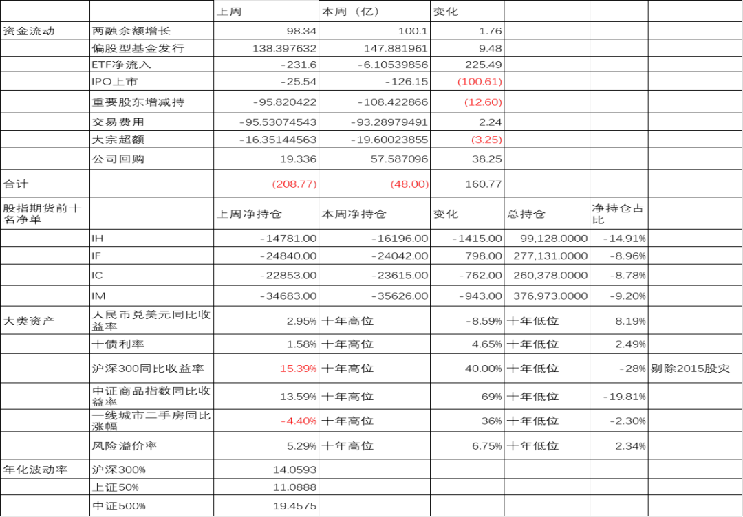 短期资金:中性 上周股市震荡,短期资金继续流出,两融杠杆资金维持流入,但ETF小幅流出,偏股型基金发行下降,IPO上市增加,产业股东减持维持高位,大宗交易缩量,公司回购稳定。