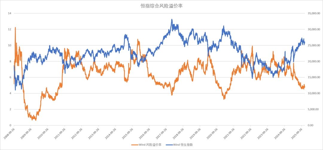 10年期美债利率4.14%,恒生指数以中美10年期国债平均收益率计算风险溢价率偏低。
