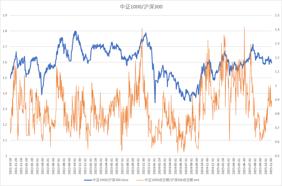中证1000与沪深300的比值震荡,成交占比中性。