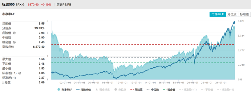 美股估值处于历史高位,SP500市盈率三十年分位数95%,市净率分位数99%。