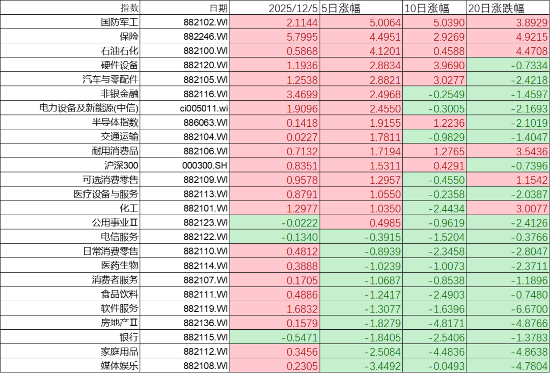 上周市场行业表现上国防军工、保险、石油石化领涨,媒体娱乐、家庭用品、银行地产领地。