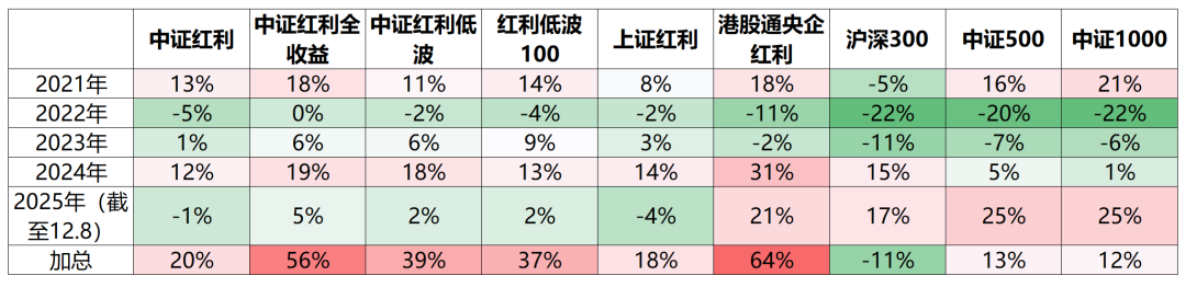 我们对比近五年各类红利指数以及宽基指数的表现,表现最为突出的是港股通央企红利 +64%,其次是中证红利全收益 +56%,中证红利低波和中证红利低波100也有近 +40%的不俗表现。