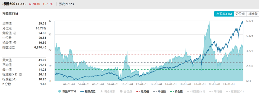 美股估值处于历史高位,SP500市盈率三十年分位数95%,市净率分位数99%。