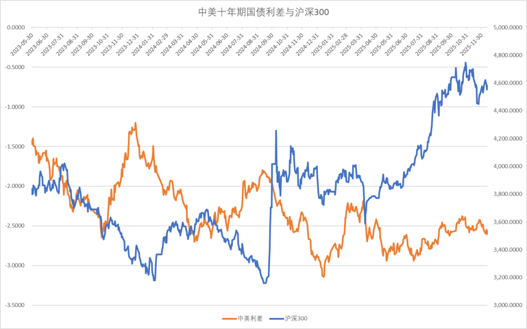 中美十年期国债利差震荡下行。