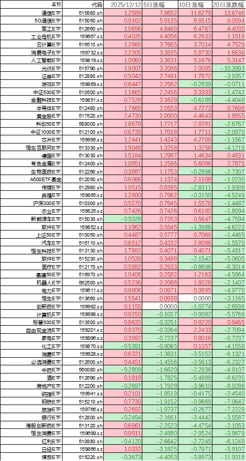 上周ETF市场通信、5G、军工等ETF领涨,煤炭、日经、红利、消费、创新药ETF等垫底。