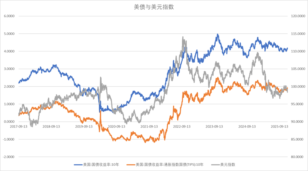美十年期国债利率、实际利率震荡、美元小幅回落。