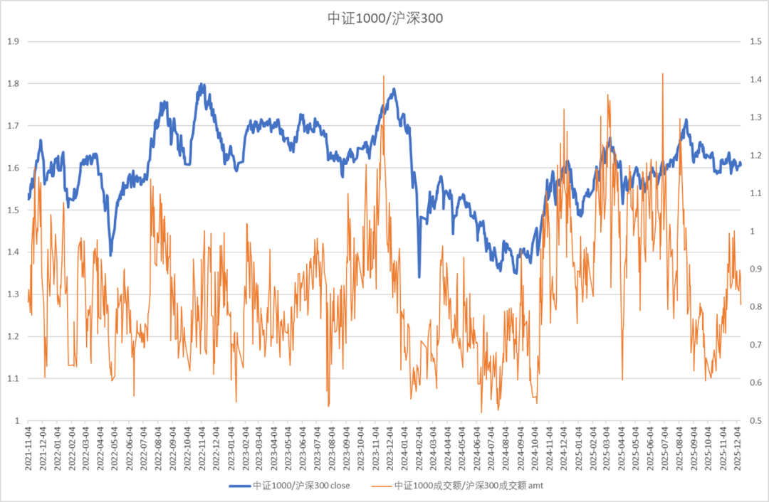 中证1000与沪深300的比值震荡,成交占比下降。