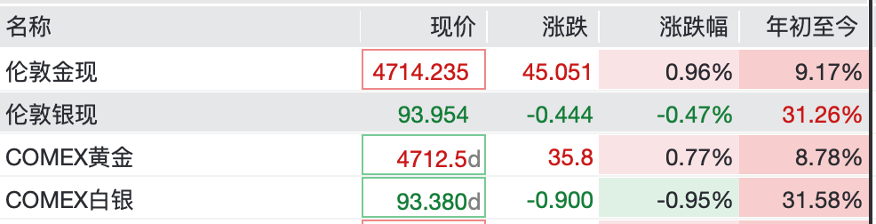 黄金白银走势分化,现货黄金午后站上4700美元,截至发稿,涨幅扩大至近1%,年初至今涨超9%。