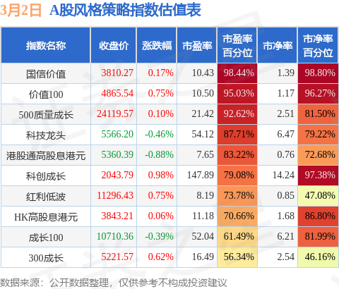风格策略指数方面,国信价值的市盈率百分位较高,为98.44%。而300成长(562310)的市盈率百分位较低,为56.34%。