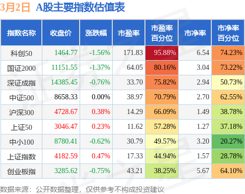 A股主要宽基指数方面,科创50(1B0688)的市盈率百分位较高,为95.88%。而创业板指(399006)的市盈率百分位较低,为38.25%。